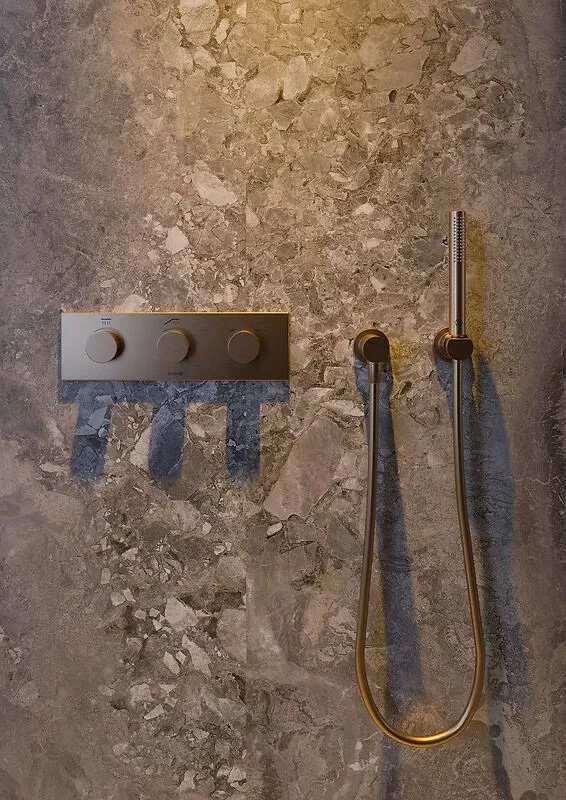 Dabei sieht man der ultraflachen, aus hochwertigem Metall gefertigten Variante Kludi-PushTronic ihr digitales Innenleben gar nicht an. Denn hier erfolgt die Bedienung über drei ergonomisch geformte Drück- und Drehknöpfe. Um das Wasser – getrennt für zwei Verbraucher wie etwa Hand- und Kopfbrause – an- und auszuschalten, genügt ein Druck auf den jeweiligen Knopf. Die Wassermenge wird reguliert, indem man die Regler nach rechts oder links dreht. Über ein drittes Bedienelement wird durch Drehen die Wassertemperatur eingestellt. Wassermenge und -temperatur sind beim Start auf einen sparsamen Durchfluss von acht Liter pro Minute bzw. eine Temperatur von 35° Celsius voreingestellt. Eine integrierte Temperatursperre verhindert, dass das Duschwasser heißer als 44° Celsius wird. Neben der ebenso einfachen wie intuitiven Bedienung punktet Kludi-PushTronic mit ihrem reduzierten Design und ihrer exakten Geradlinigkeit. Erhältlich ist die Duschsteuerung in verschiedenen Oberflächen, unter anderem in Chrom, Mattschwarz, Mattweiß sowie in gebürstetem Bronze und Gold (PVD-Beschichtung).