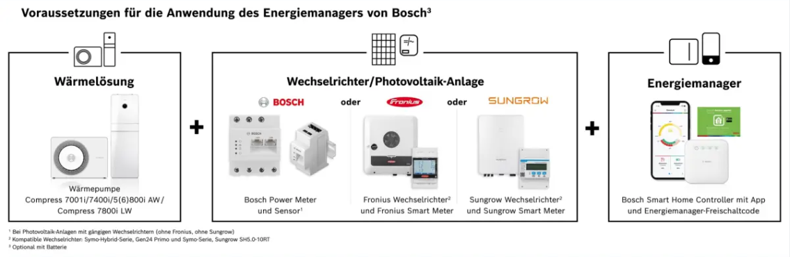 Voraussetzung für den Energiemanager im Bosch Smart Home ist eine Wärmepumpe und eine Photovoltaik Anlage mit einem Fronius Symo Wechselrichter oder einem Sungrow Wechselrichter oder einem Bosch Power Meter, die beide mit dem Internet-Router verbunden sind.